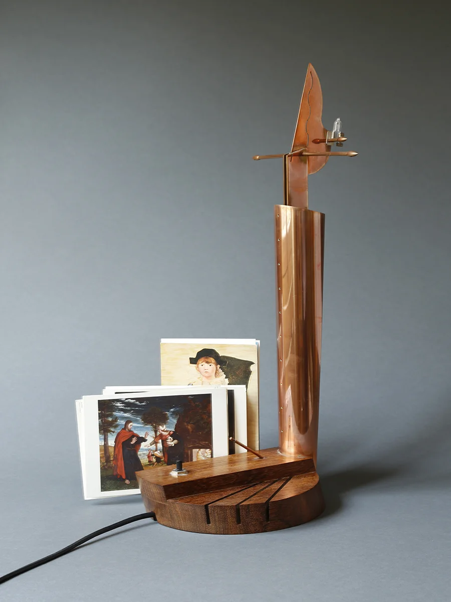 Cuivre, carte postale, ampoule H2, élastique, palissandre.